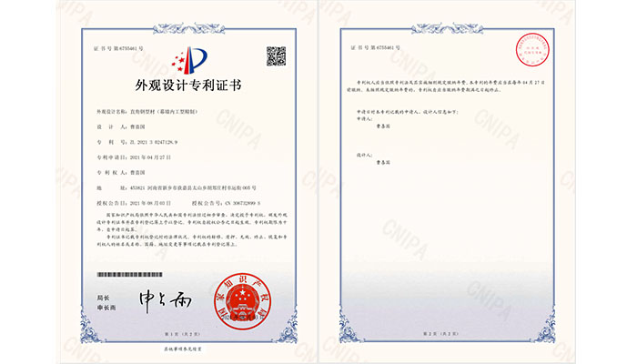 西創(chuàng)系統(tǒng)直角鋼型材幕墻內(nèi)工型專利證書